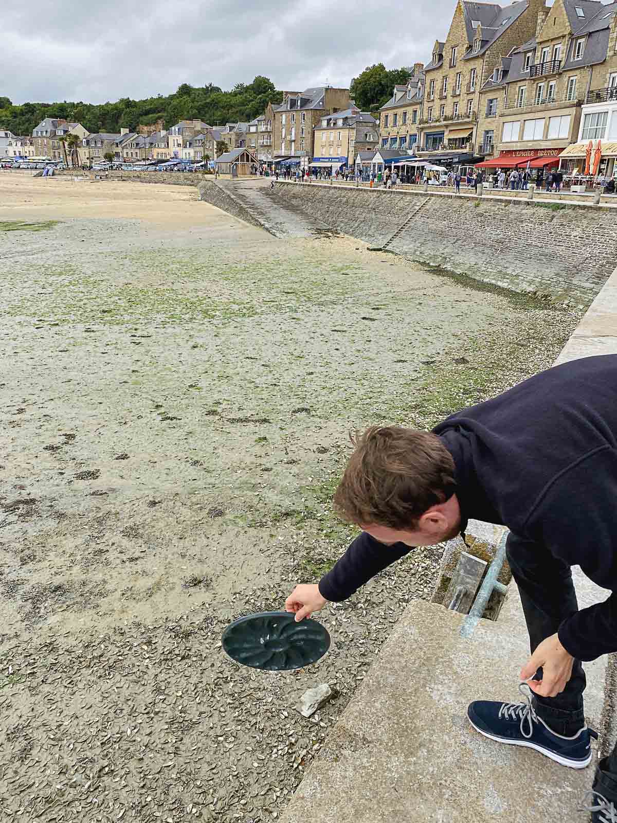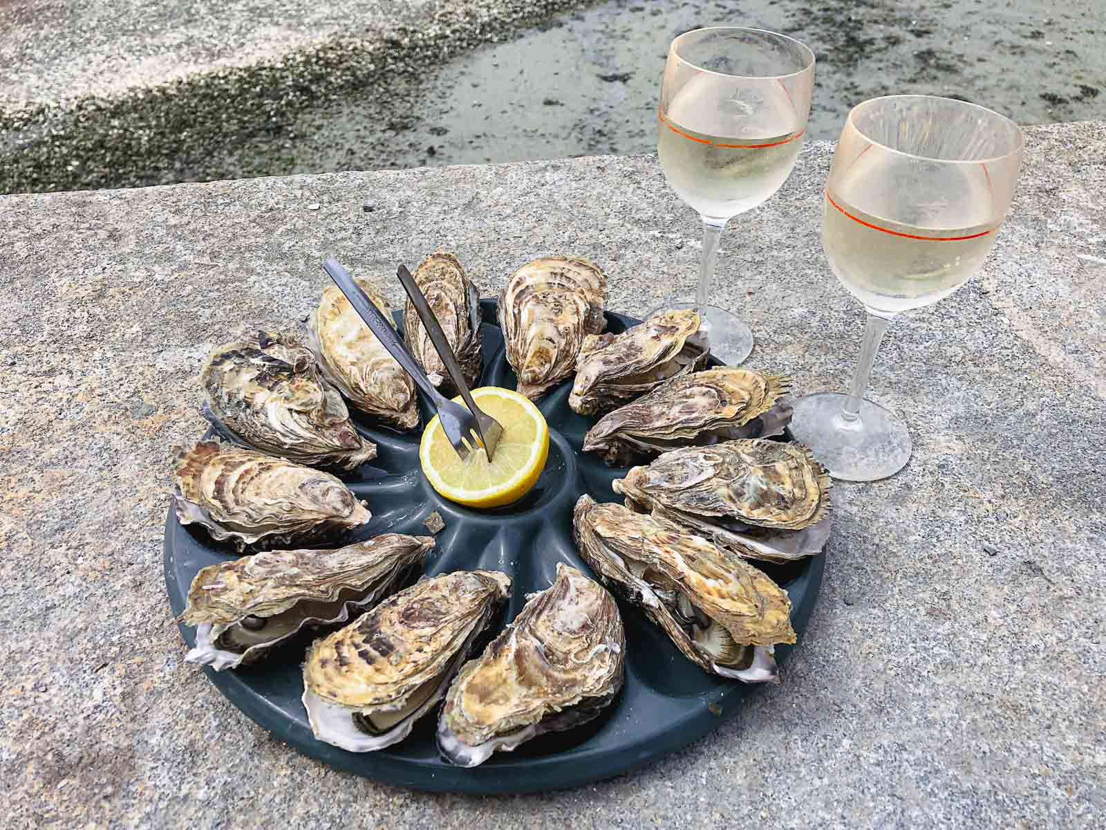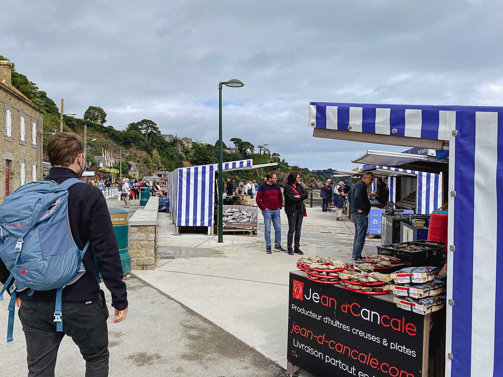 „Austern in Cancale“– das war unser Bretagne-Auftakt! Je nachdem ob Ihr den frischen Meeresfrüchten etwas abgewinnen könnt, empfehlen wir Euch auf jeden Fall einen Stop im Hafen von Cancale. Hier gibt es frische und günstige Austern! Wir haben auf einem kostenfreien Parkplatz ober Cancale geparkt und sind dann in den Hafen spaziert. Schlendert am besten entlang der Promenade bis zum Marché aux Huîtres de Cancale. Die blau-weiß gestreiften Ständchen an denen die Austern angeboten werden, sind nicht zu übersehen. Die Austern werden vor euren Augen professionell geöffnet. Der Preis der Austern hängt von Art und Größe ab: 12 Austern mittlerer Größe gibt es schon ab ca. 7€. Den passenden Vin blanc findet man ein paar Stände weiter. Mit den Austern lässt man sich an der Promenade nieder und genießt diese Delikatesse. Nach dem Verzehr werden die Schalen, wie es für Cancale typisch ist, wieder zurück ins Meer geworfen. Also wundert Euch nicht über die Berge an Austern-Schalen in der Hafenbucht.