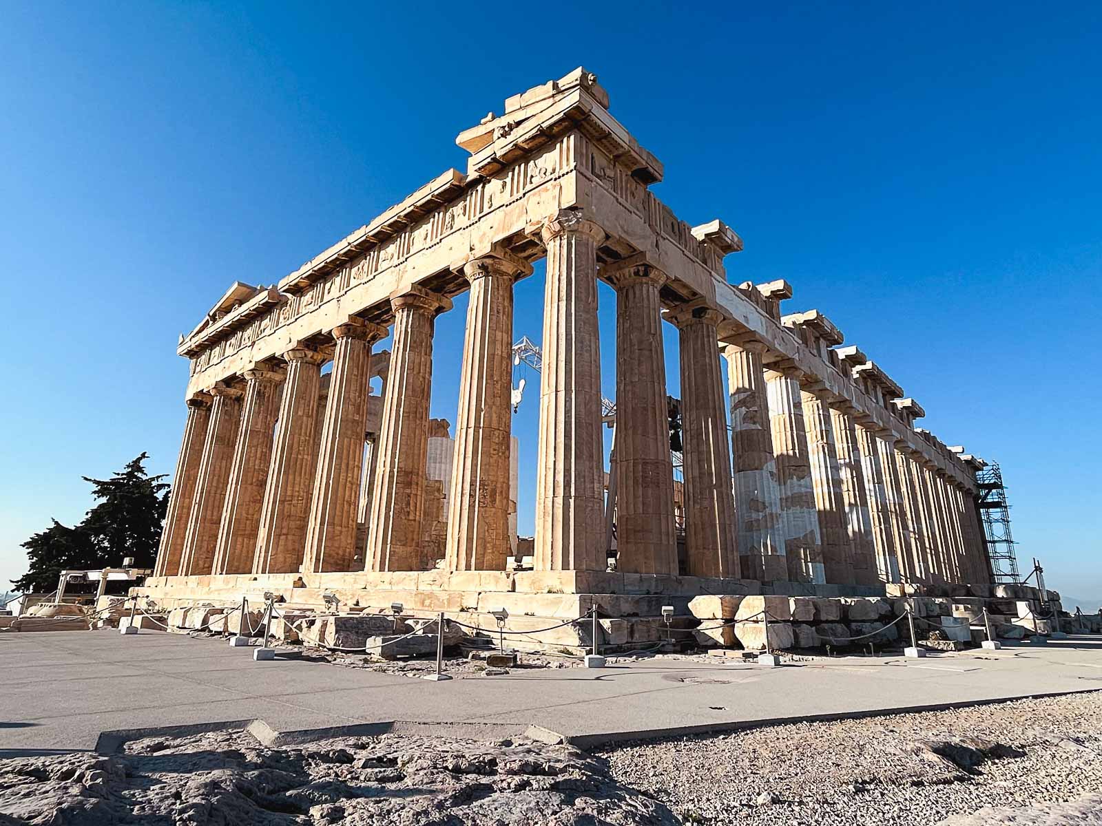 Bei der Akropolis handelt es sich nicht um den „Parthenon“ Tempel auf dem Akropolis Hügel. Die Akropolis war einst ein religiöses Zentrum welches neben dem Parthenon noch unter anderem aus dem „Athena Tempel“, den „Propyläen“ und dem „Erechtheion“ besteht. Der Eintritt in die Akropolis beinhaltet neben den Bauwerken am Akropolis Hügel noch die Besichtigung des „Dionysos Theater“ sowie das „Odeion des Heodes Atticus“. Für den Besuch der Akropolis solltet ihr mindestens 2 Stunden planen, natürlich stark abhängig davon wie sehr Ihr an der antiken Geschichte interessiert seid.